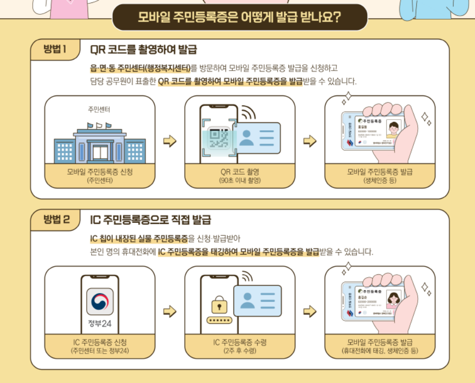 모바일 주민등록증은 IC칩 방식과 QR코드 방식, 두 가지 방법 중 하나를 통해 발급받을 수 있다.