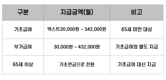 ● 기초급여와 부가급여를 합산하면 최대 43.2만 원까지 수령 가능하며, 가구별 상황에 따라 달라집니다.