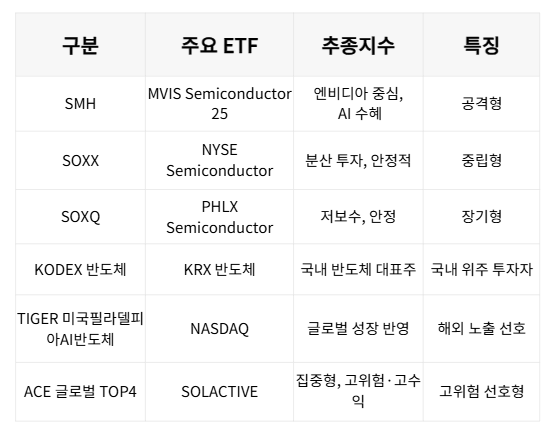 SMH·SOXX 등 미국 주요 ETF부터 KODEX·TIGER 국내 ETF까지 수익률, 구성비, 투자전략을 한눈에 비교 분석합니다.